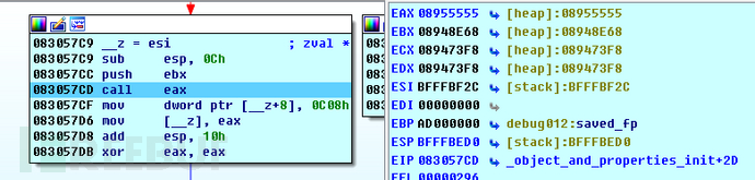 这里考虑另一种劫持EIP的方法,覆盖对象虚表的方法(一般情况下有三种常见的方法,在笔者之前的分析《kill.exe溢出漏洞分析与EXP讨论》中有提到,感兴趣的读者可以看一下)。构造合适的php页面,令PHP不崩溃,而是让其继续下去的话,就会发现PHP接下来将要调用_object_init_ex()函数,初始化异常对象。该初始化函数会进一步调用object_and_properties_init()函数,而在此函数中,会调用对象虚表中的函数,关键代码段如下: