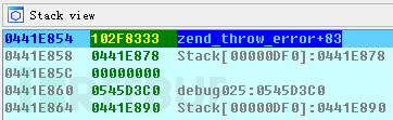 上图中,栈顶是函数返回地址,即返回到zend_throw_error()函数中,接下来的是vspprintf()函数的四个参数。其中,0441E890即为va_list类型的参数。
