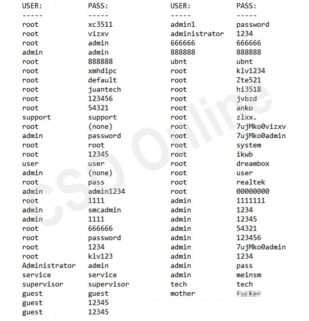 据透露, Mirai 僵尸网络——最近涉及计算机攻击的两大网络之一——使用了 61 个用户名和密码的组合来强行入侵全球数千台设备。看一下来自僵尸网络源代码的密码形式:“pssword”,“1234”,“admin”及“guest”……是不是有一种似曾相识的感觉?在互联设备中,从路由器到数码摄影机等家用设备,都广泛使用默认密码——这些默认密码也是最容易遭到 DDoS 攻击的对象。(via 雷锋网)