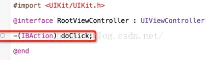 表示会出现在拖的列表中了,然后如果想赋值给这个属性,就把他拖到指定对象即可,所以中这里也可以看到iOS中的xib和Android中的布局文件有点区别。还有一个是IBAction特性,这个主要是添加控件的事件的,这个一般是添加在一个方法中的,然后这个方法就会出现在拖的列表中,比如我们在控制器中定义一个这个方法: