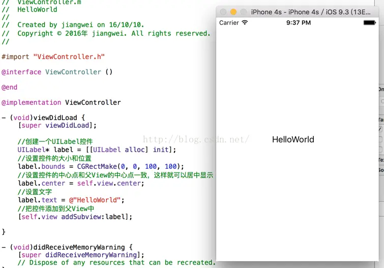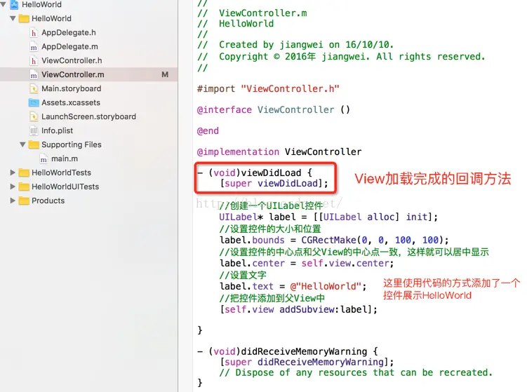这样项目就建立好了,下面我们让程序运行起来,展示一个HelloWorld文字。这个有两种方式,在Android中也是类似,我们这里使用UILabel来进行操作。类似于Android中的TextView控件,一种方式是代码写布局,一种是采用拖的方式类似于Android中的布局文件。这里为了方便而且以后会详细介绍拖的那种方式,直接用代码进行编写了。