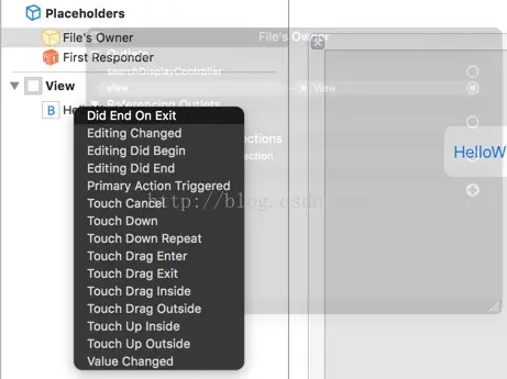 这里可以看到了,当你去拖doClick方法的右边加号圆圈到一个UIButton控件上的时候,会出现这个界面,其中列举了多个事件,我们可以选中一个之后,就表示这里的UIButton控件的这个事件触发的方法是doClick了。从这个可以看到给View控件赋值和添加事件的方法还是非常方便的,而在Android中就需要findViewById方法,然后在set一些事件回调了,当然Android中现在有一些开源框架做到了这种类似功能,主要采用注解功能,无序findViewById赋值和添加事件了。不过我不怎么喜欢使用这个框架,感觉原生最好!