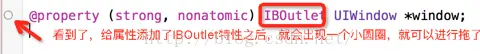 在iOS中有一个很方便的功能,就是给对象赋值以及后面给控件添加事件,有时候可以选择拖这种快捷方式的,不过得有一个前提,就是这个属性必须设置IBOutlet特性,设置之后就可以看到属性前面有一个小圆圈了: