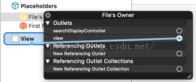 搜索View控件,找到之后,直接拖到xib内容中即可。托成功之后,我们还需要把控制器的view属性关联到这个View控件中,不然也是会报错的。这里就很简单了,对于Xcode开发工具来说,只要一拖连接即可。如下图所示: