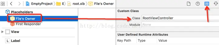 然后我们把当前的xib的File's Owner设置成我们的根控制器,这里必须得设置xib的File' Owner,不然会报错的。