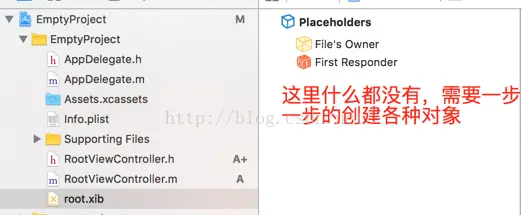 从这里就可以看到,一个应用其实最基本的元素一定有UIApplicationDelegate和UIWindow和根控制器即可,那么这个其实也是一个简单的应用了,但是在实际开发中肯定是包含多个控制器的,并且每个根控制器都对应一个View布局文件,所以下面就开始手把手的创建对应的View信息。当然这里可以可以在控制器的回调方法中手动的编码添加View,但是这里我们在介绍iOS中其实和Android一样,每个控制器都有对应的布局文件,这里叫做xib文件。