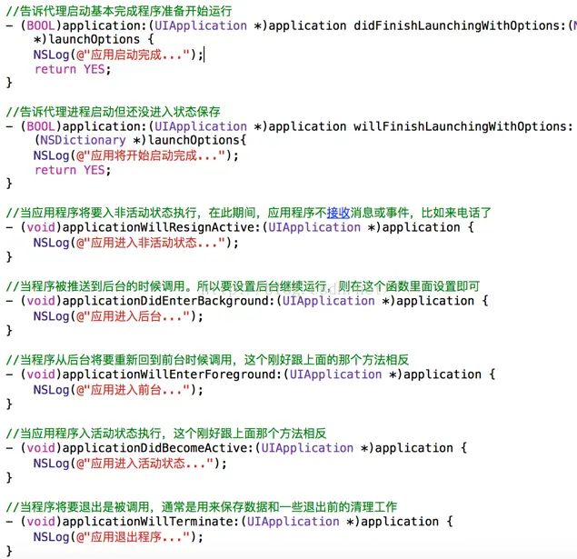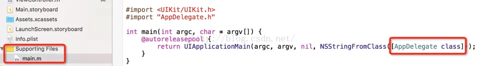 每个程序都有一个main.m这个类,内部有一个main方法,而这个方法我们看到和C语言中的main函数形式是一致的,入口就在这里,那么这里干了一件事就是托付应用程序的代理对象AppDelegate类,也就是把整个应用程序的逻辑都托付给了AppDelegate类,在iOS中这种方式叫做代理,而在Android中我们通常叫做回调机制,然后UIApplicationMain类就会和AppDelegate类进行交互,比如应用的生命周期,事件处理等,那么下面就来看一下AppDelegate这个类: