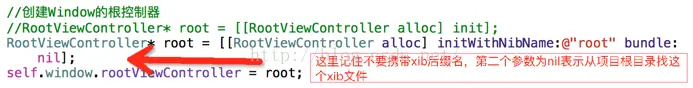 控制器提供了一个initWithNibName:bundle:方法,这个方法可以显示的加载一个xib文件,这里需要注意两点就是xib文件名不能携带后缀名,其次就是第二个参数表示xib文件的路径,传入nil表示从项目的根目录中查找。