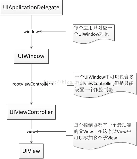 从这张图中,可以了解到,一个应用程序一定包含了程序应用的代理对象UIAppDelegate类,应用窗口UIWindow类。然后窗口还有一个根控制器页面UIViewController类,每个控制器都有一个展示UI的父View,根控制器也不例外。最后是每个控制器都会关联一个父View用于展示每个页面的UI。