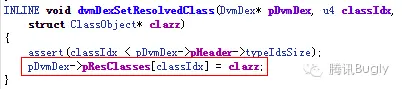 dvmResolveClass 在最开始会优先从当前 dex 已解析类的缓存里找被引用类,找到了直接返回,找不到时说明被引用类还没有被加载,接着加载成功后,会往当前 dex 缓存里设置上这个类的引用,后续所有对补丁类的解析引用都不会走到后面的“unexpected DEX”异常逻辑里,至于 dex 里已解析类 get/set 的相关逻辑如下: