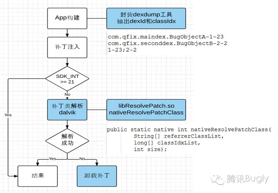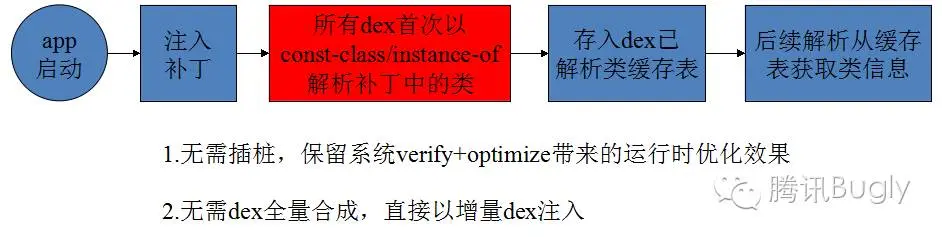 可以看出,新的方案是很轻量级的实现,只需一个很简单的 jni 方法调用就能解决问题,既不用构建时预先插桩去 preverify,也不用下载补丁后进行 dex 的全量合成。