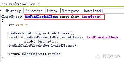 这里的关键是能获取到前两个参数的值,第一个参数引用类的 ClassObject,最初借鉴的是 dvmResolveClass 里调用的 dvmFindClassNoInit 这个方法,但这个方法获取一个类的 ClassObject 需要两个参数,其中类名很容易构造,但需要额外的操作获取引用类的 ClassLoader 对象的地址,之后又找到一个更便利的方法 dvmFindLoadedClass: