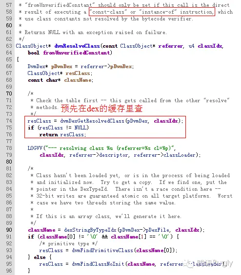 这段逻辑所在的方法是 dvmResolveClass,通过类之间的引用会调用这个方法,入口参数分别是引用类的 ClassObject,被引用类的 classIdx,以及引用关联的 dalvik 指令是否为 const-class/instance-of,返回的是被引用类的 ClassObject,经反复阅读分析,终于发现了一个可以利用的细节: