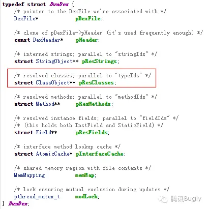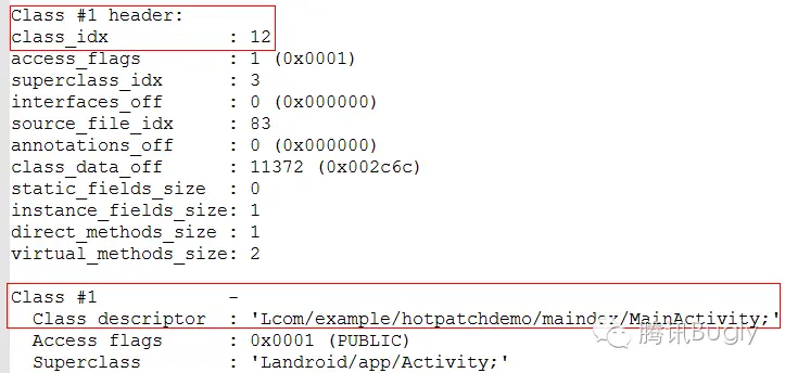 这个方法只用传入类的描述符即可,但必须是已经加载成功的类,在补丁注入成功后,在每个 dex 里找一个固定的已经加载成功的引用类并不难。对于主dex,直接用 XXXApplication 类就行,对于其它分 dex,手Q的分 dex 方案有这样的逻辑:每当一个分 dex 完成注入,手Q都会尝试加载该 dex 里的一个固定空类来验证分 dex 是否注入成功了,所以这个固定的空类可以作为补丁的引用类使用。第二个参数 classIdx,可以通过 dexdump -h 获取: