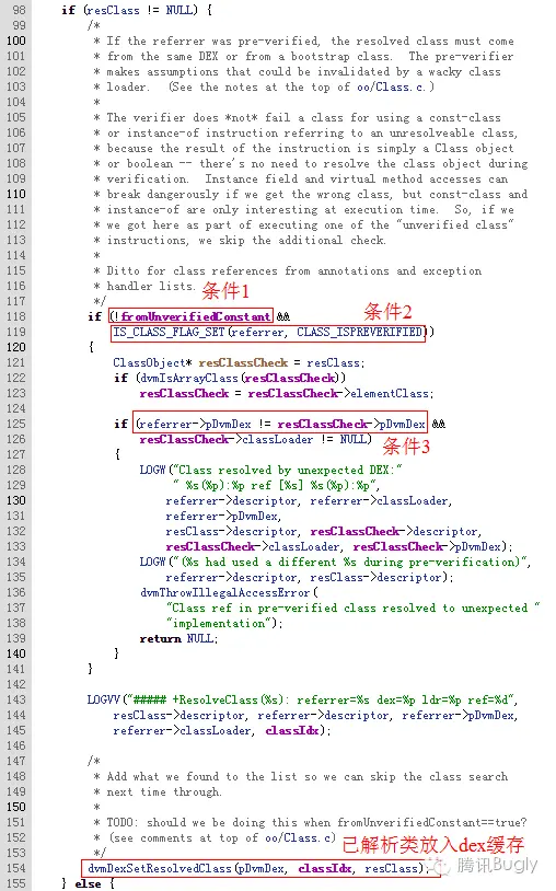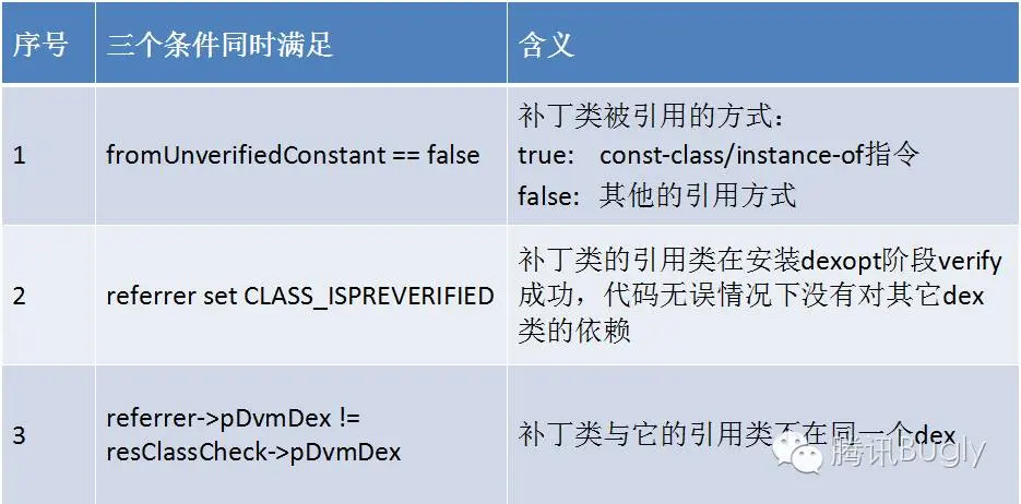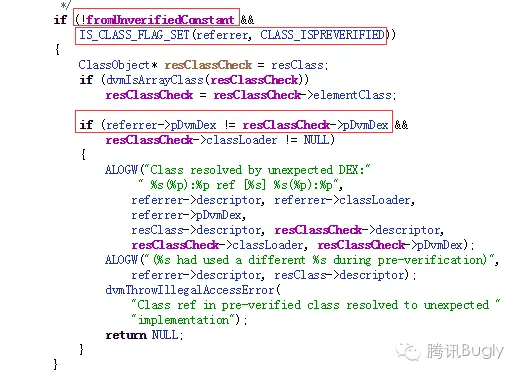 这是 dalvik 的一段源码,当补丁安装后,首次使用到补丁里的类时会调用到这里,需要同时满足图中标出来的三个条件,才能出现异常,这三个条件的含义如下: