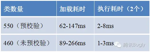 2)预先引用解析所有类,会增加引用类的加载耗时和引用语句本身的执行耗时,对于执行耗时,可以通过添加条件判断来优化,如果要解析的类在补丁类名列表里就执行该语句,否则就不执行,对于加载耗时,初步的测试结果如下(这里一个划分的区包含500个左右的类,并进一步区分了是否 preverify,而测试的补丁包里包含2个类):