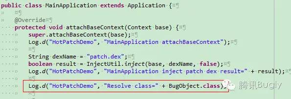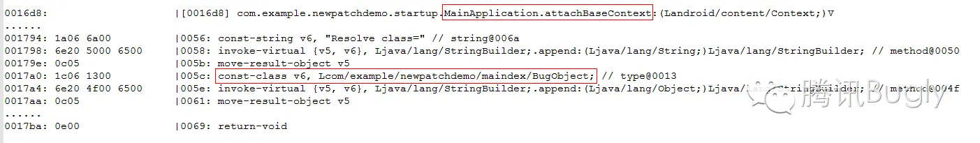 demo 里补丁包含的类是 BugObject,通过对比,如果代码不包含上图红框里的预先引用的逻辑,出现了预期的“unexpected DEX”异常,如果加上这一行代码,demo 运行正常,而且补丁的修复功能也生效。通过 dexdump 查看,确实是优先通过 const-class 指令引用补丁类的。
