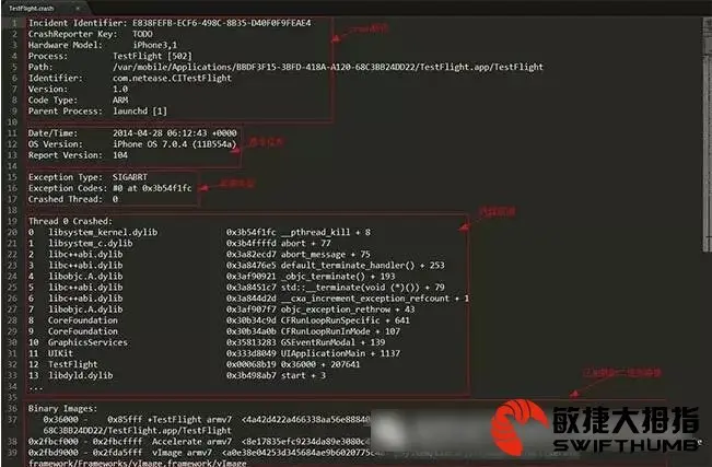 5)二进制映像是指crash发生时已加载的二进制文件。以上就是一份crash日志包含的所有信息,接下来就需要根据这些信息去解析定位导致crash发生的代码逻辑, 这就需要用到符号化解析的过程(洋名叫:symbolication)。