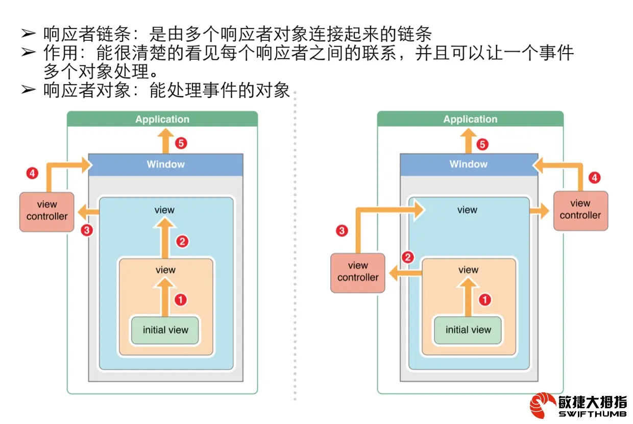 响应者对象(Responder Object),指的是有响应和处理事件能力的对象。响应者链就是由一系列的响应者对象构成的一个层次结构。