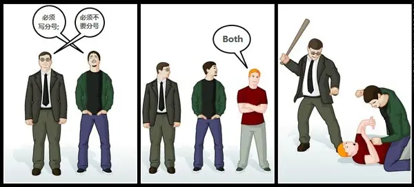 重申一下分号的作用——作为语句的断言(EOS),目的是让解析器正确解析程序。那既然存在ASI机制,那为什么还有那么多团队的代码规范中还规定必须写分号呢?不外乎三个原因:1. 因为存在No ASI的情况,懒得记忆这些特例;2. 团队的工程师需要兼顾前后端开发(苦逼如我~~),而后端采用Java、C#或PHP,保持两端代码规范接近管理成本较低;3. 旧有的规范就是这样,现在也没必要改了。