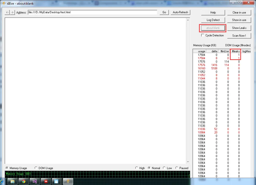 1. 当前页面泄漏:Windows的任务管理器、Chrome->dev tools->Profiles->Take Heap Snapshot/Record Heap Allocations等等