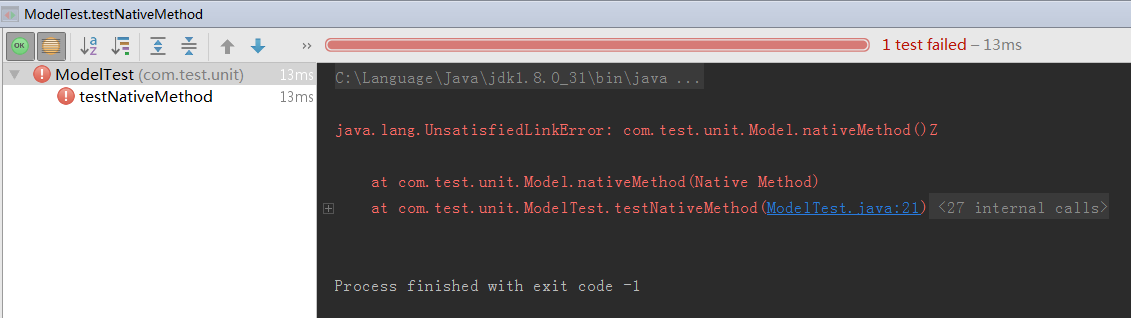 run ModelTest... 报错java.lang.UnsatisfiedLinkError: com.test.unit.Model.nativeMethod()