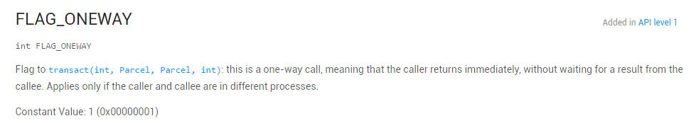 查看 API 文档即可以看到 FLAG_ONEWAY 的作用就是让客户端能够非阻塞的调用远程方法,至此真相大白,如果我们自定义的 aidl 也想实现非阻塞的调用,只需声明 oneway 关键字即可。