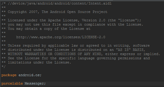 当然,Messenger 除了继承 Parcelable 外,还需要声明一个同名的 Messenger.aidl 文件,可以在 framework 层源码下 android.os 包中找到 Messenger.aidl 文件,对于写过 aidl 的童鞋,肯定不陌生了。