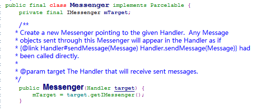 从上面可以看到 mTarget 是一个 IMessenger 实例,作为 Messenger 唯一的成员变量。 初始化 mTarget 是在 public Messenger(Handler target) 构造函数中,利用 Handler 的 getIMessenger 方法来获取一个 IMessenger 的实例。