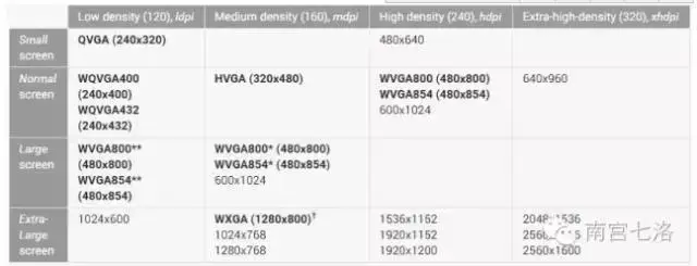 如图所示,像素密度在120左右的屏幕归为ldpi,160左右的归为mdpi,以此类推。这样,所有的Android屏幕都找到了自己的位置,并赋予了相应的倍率:
