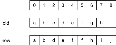上图中,old dex中下标为2的item “c” 被DEL,c后面的元素前移,new dex中下标5处ADD一个item “f”,而在下标8处又ADD一个item “j”。