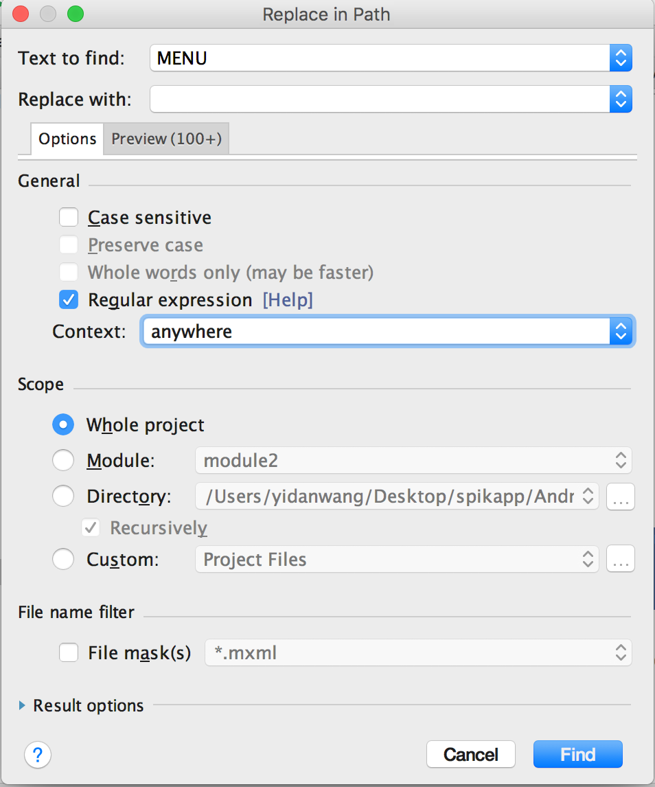 Scope是查找范围,可以选择整个项目,某个模块,某个路径,或者某个文件,使用起来非常灵活。