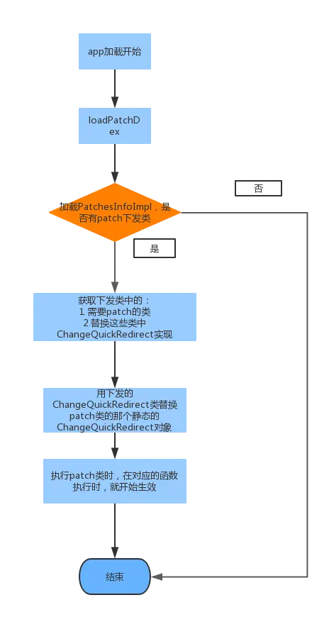 当app加载时通过PatchesInfoImpl这个类中的getPatchedClassesInfo的信息,来获取那些需要打补丁(而不是每个类都打补丁,这就相当于下发补丁类),以及将补丁锲子替换之前类的锲子(实际上就是用我们下发的ChangeQuickRedirect来替换补丁类的ChangeQuickRedirect的静态变量。)