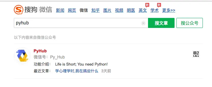 搜狗微信搜索提供两种类型的关键词搜索,一种是搜索公众号文章内容,另一种是直接搜索微信公众号。通过微信公众号搜索可以获取公众号的基本信息及最近发布的10条文章,之前写过一篇《Python 抓取微信公众号文章》,今天来抓取一下微信公众号的账号信息(→ 先看结果(2998条) ←)。