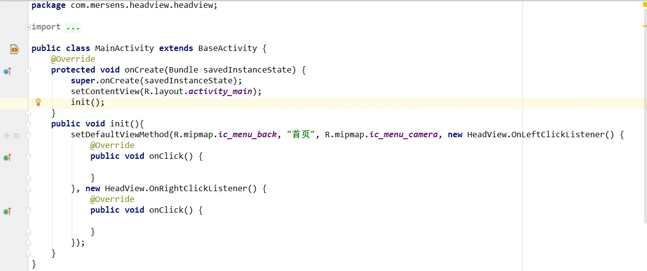 public void setDefaultViewMethod(intleftsrcid, String title,intrightsrcid, HeadView.OnLeftClickListener onleftclicklistener, HeadView.OnRightClickListener onrightclicklistener) {