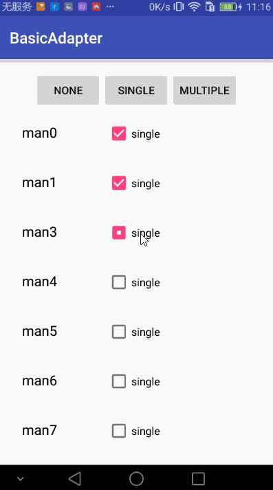 需要注意的是,在choice mode为single的时候,内部是改变了所有item的check state,然后调用notifyDataSetChange(),此时UI上如果是Material Design的Checkbox便不会有动画的渲染便直接选中.此处若有解决思路或者办法,希望一起讨论下.