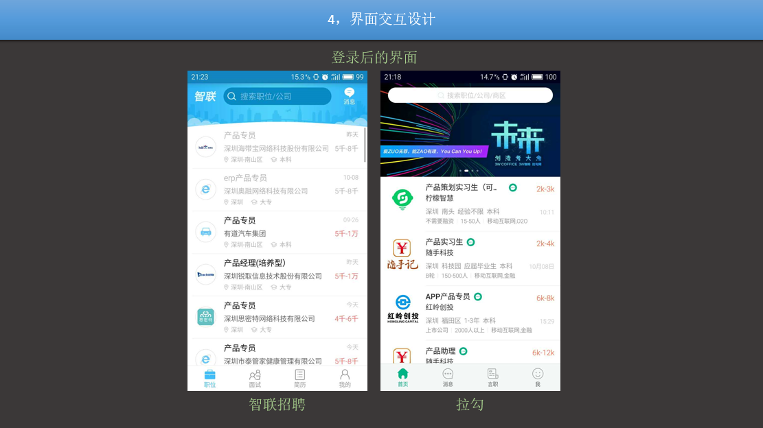 无论是智联招聘还是拉勾,都是以大而全的网页为主,移动端为辅,移动端更多的只是为了弥补网页版无法做到的事情,比如你在某个场合无法登录电脑网页或者是不方便让别人知道你在找工作,所以在移动端应该尽量做得轻便。智联招聘用户量多,在大学生群体中更加容易形成一种互相推荐的效果,但是某些行业的企业质量差,比如很多互联网行业的培训机构伪装成招聘公司,把你叫过去面试,然后诱惑你参加培训机构。拉勾专注互联网领域的招聘,它提供的信息更加准确,提供的企业质量比智联招聘高,更多的引导求职者在了解公司情况与岗位要求后在投递简历,而不是盲目的海投简历,移动端做得也比较轻便,而且加入“言职”功能,尝试与找到工作的用户依然保持粘度。