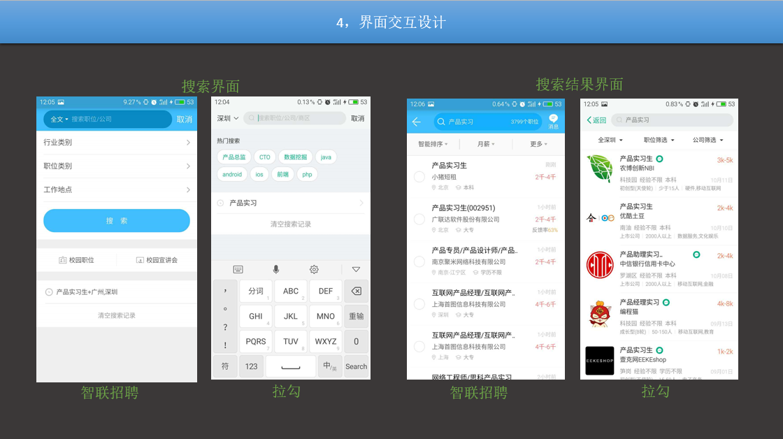 在搜索界面中,智联招聘提供了行业类别,职位类别,工作地点等关键词筛选功能和一个搜索按钮,拉勾只能凭借输入法进入搜索结果界面。
