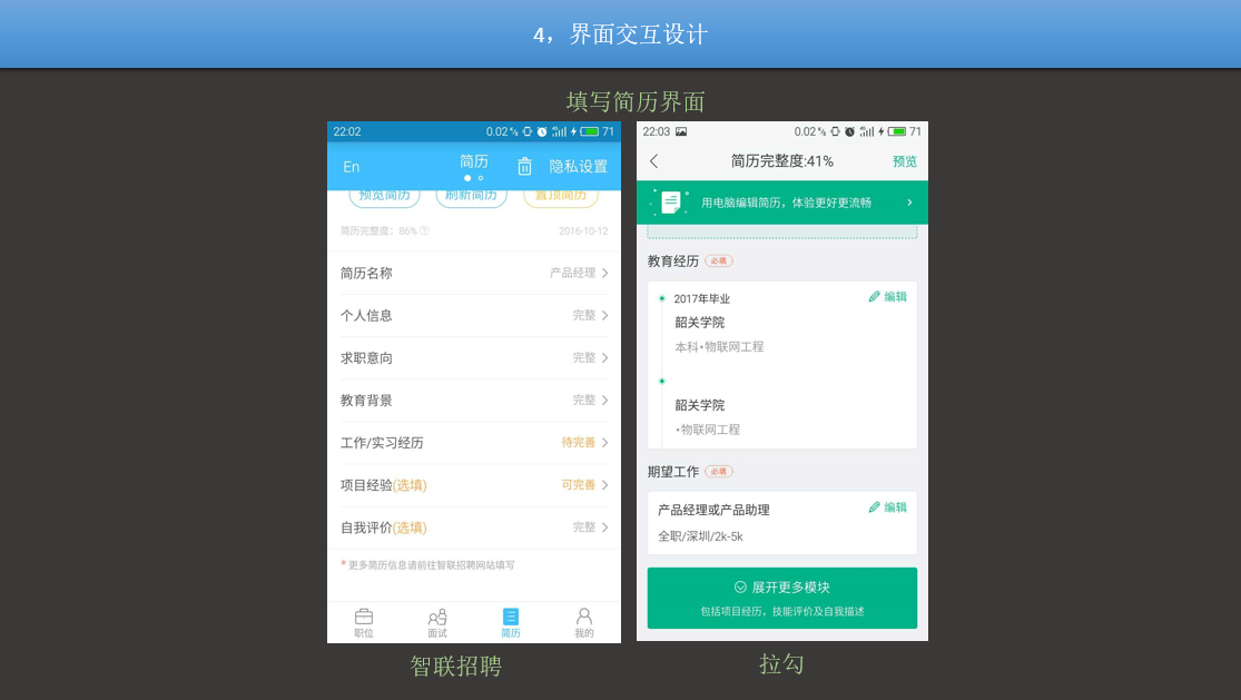 因为填写简历过程比较麻烦,而且大部分资料都在PC端,因此两款APP都限制用户在移动端编辑部分信息,建议在PC端完善。这也说明了移动端更多的只是网页的一个补充。