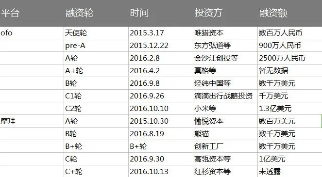 ofo到目前为止共融资6轮,投资方包括沙江创投、真格基金、经纬中国等这些老牌,以及唯猎、东方弘道新锐,最重要的是获得了滴滴的战略投资,其两者本质上都是做平台模式,气质相投;而不要忘记的是相对于的摩拜的“产品+技术”模式,很大程度上,ofo是占据了成本价格的优势。
