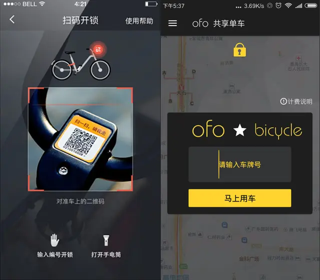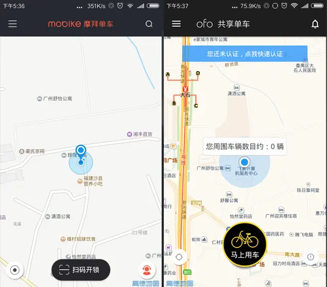 进入ofo和摩拜的app首页就看到地图上显示自己的定位和附近车辆情况,找到距我最近(或适合位置)的车辆,不同的是摩拜点一下则会显示通往单车的步行路线,页面上部显示单车地点,数量,距离,步行时间,再点一下可以提前15分钟预约单车,到达车辆地点后直接使用首页的扫码开锁,很方便。如果第一次使用,未完成认证会提示你去完成认证再来扫描的。而ofo则是点击马上用车进入输入号码框,提示输入用车的号码牌即可解使用。