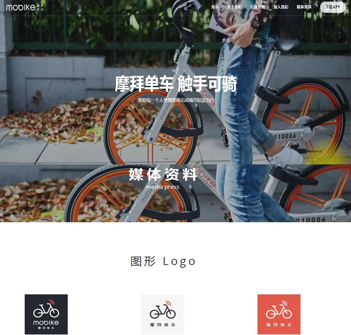 摩拜单车非常注重品牌自主的对外宣传,他们在官网上开设了博客,发布举办的活动以及车主生活,所有的报道以及宣传内容都有非常核心的共同点,主打生活方式。并且你还能在摩拜的官方网站上找到一个一个页面专门放置“媒体资料”,这个页面中放置了摩拜单车的三款图形logo、文字Typo以及logo的色彩值提示。他们已经将品牌的基础宣传资料公开发布,任君取用,这正是他们注重宣传的表现,欢迎所有媒体报道。