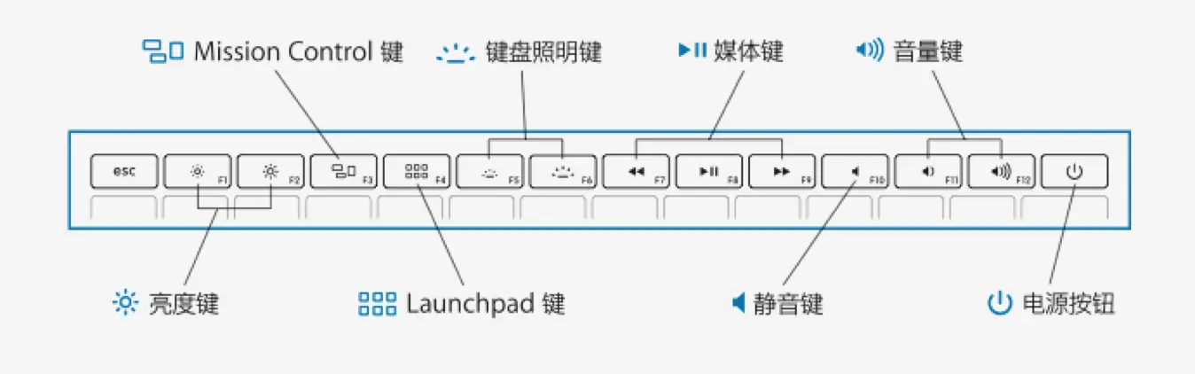 在一些Apple自己的键盘上,通常顶行会有特殊案件,有音量图标、显示屏亮度图标和其他功能图标。按图标建可执行相应功能,或者将其与Fn键组合使用,来作F1、F2、F3或其他标准功能键。