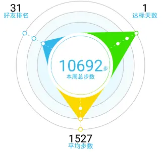 看起来代码有点多,其实是最简单的,就是确定好友排名的坐标(-circleRadius,-(circleRadius-marginCircleSize)),int margin=circleRadius/5,平均步数的坐标(0,circleRadius+margin),达标天数的坐标(circleRadius,-(circleRadius-marginCircleSize))来进行drawText的操作而已,没什么可以说的,Rect是得出字体大小的,具体看上面代码。效果如下图: