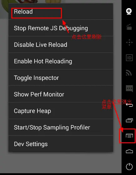 那如果我们修改了代码后,难道要再重新执行一次react-native run-android?当然不是,那React Native的调试要怎么做呢,只需点击模拟器的菜单键就会弹出一个菜单,然后点击Reload,模拟器就会显示修改代码后的界面了,这是不是很方便呢!