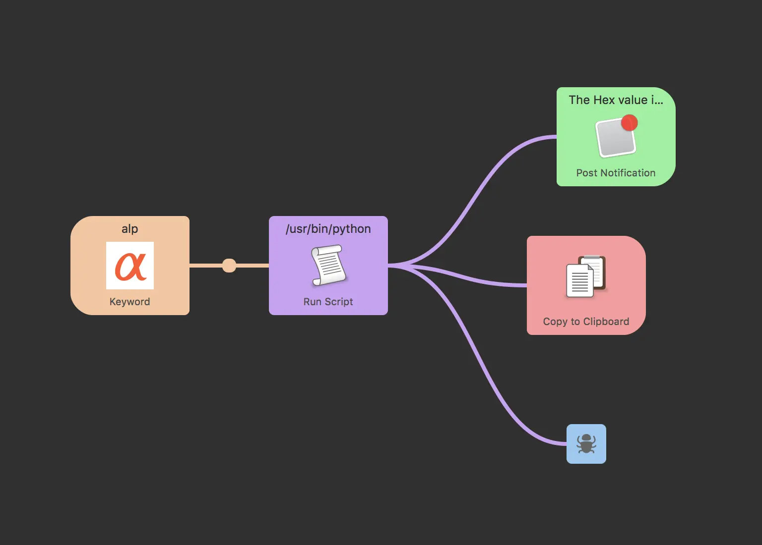 在开发中我们经常会遇到需要去计算某个透明度对应的十六进制值的情况, 比如80%的透明度对应的十六进制表示是: CD . 之前我的做法是先用计算器计算出此百分比对应的十进制值是多少, 然后再转化为对应的十六进制值. 虽然也简单但还是有点不太方便, 上周工作不忙就写了一个Alfred的workflow专门用来计算这个值.