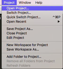 闲言少叙,配置工作做完了,咱们接下来看看怎么在 Sublime 里面构建项目吧。 首先打开 Sublime, 在菜单中打开 Project -> Open Project…