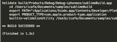 最后再提点一下, —project 配置中的 $project_base_name 对应的是我们这个 sublimeBuild.sublime-project 的文件名。 sublimeBuild.sublime-project 文件一定要和 sublimeBuild.xcodeproj 的扩展名前面的部分相同,否则以咱们这个配置就找不到 .xcodeproj 文件了。 当然这不是唯一的方法,你也可以把 .xcodeproj 的全名写在这个配置属性里。