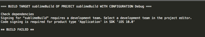 这是证书相关的问题。 最简单的办法,打开 Xcode 正确的配置好项目的 Bundle 和证书相关的内容。 当然,还可以用一些脚本自动化的处理这些事情,因为我们这次的主题是介绍 Sublime 的构建相关内容,所以就不详细讨论这个啦。