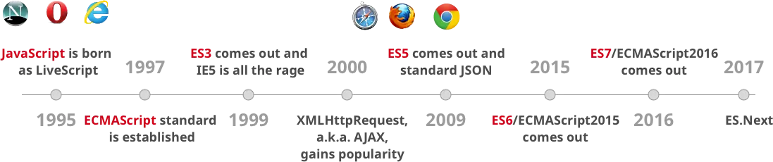 Since JavaScript conception on 1995, it has been evolving slowly. New additions happened every few years. ECMAScript came to be in 1997 to guide the path of JavaScript. It has been releasing versions such as ES3, ES5, ES6 and so on.